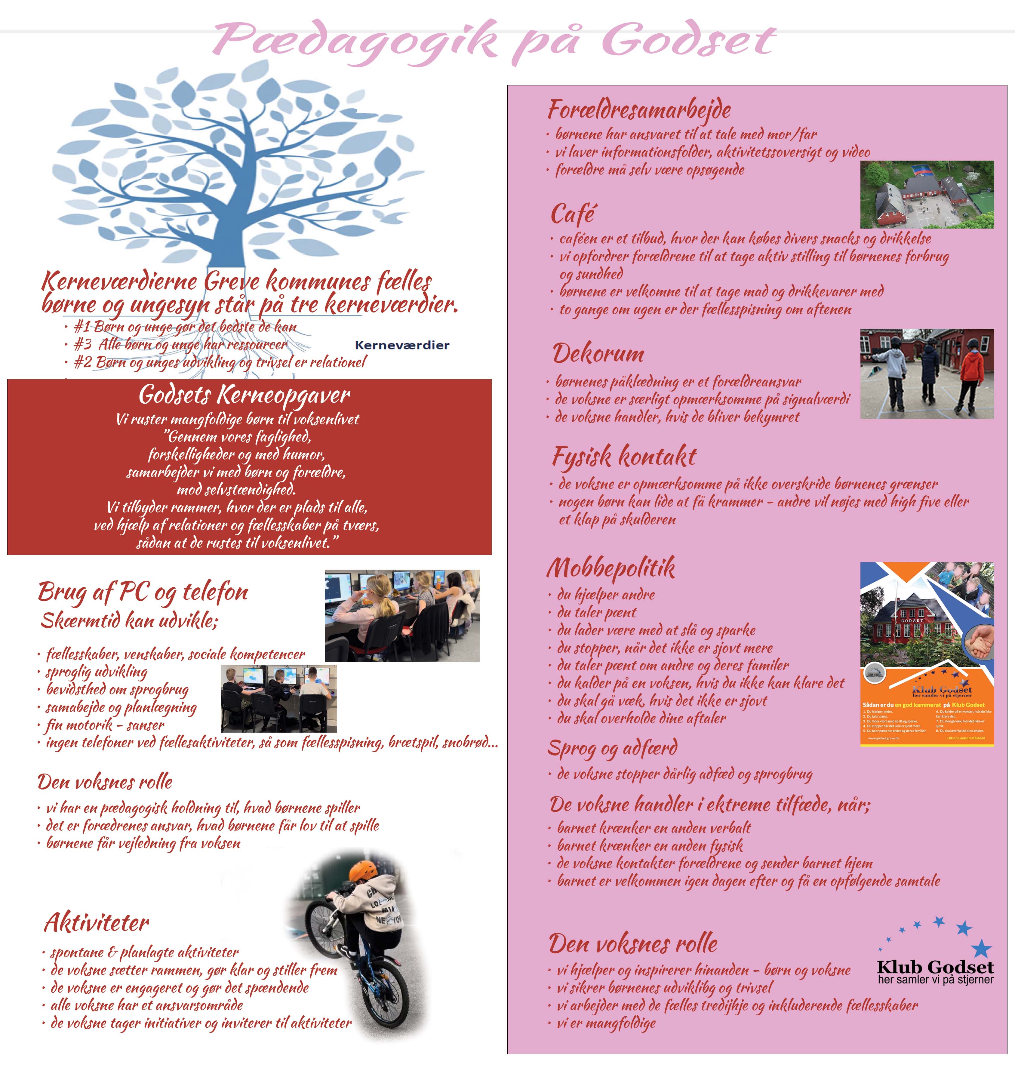 Klub Godset har åbent i sommerferien alle hverdage fra mandag d. 30. juni i uge 27 til og med fredag d. 8. august i uge 32. Åbningstiderne er klokken 10.00 - 16.00